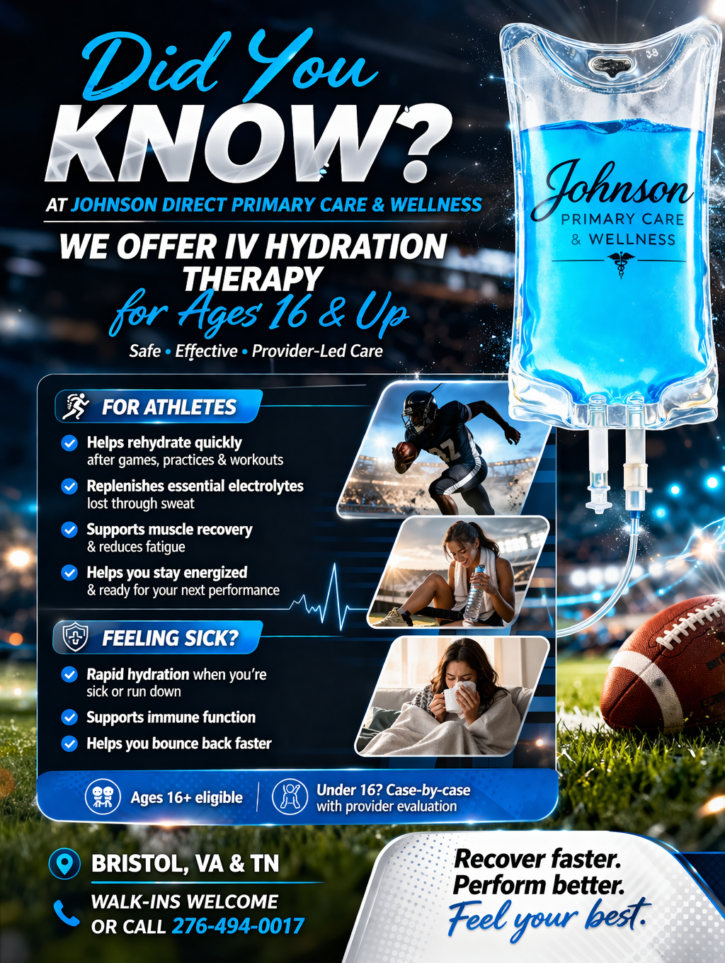 At Johnson Direct Primary Care & Wellness, we offer IV hydration therapy in Bristol, VA - TN to support hydration, recovery, and overall wellness. Our IV therapy services are available for patients 16 years and older and are designed to deliver fluids, vitamins, and nutrients directly into the bloodstream for faster absorption and results. For patients under 16, IV hydration may be considered on a case-by-case basis following evaluation by our in-house provider to ensure safety and appropriateness. We are committed to providing safe, personalized, provider-led IV therapy tailored to each patient’s individual needs.